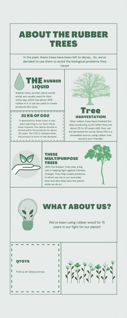 Plantation rubber trees are tapped for natural latex, and 25% of the world’s latex for rubber is from this region. Old, poor producing trees are cleared to grow young ones. In the past, these trees have been left to decay, creating biological problems. Plantation rubber trees give Qtoys products the natural beauty of wooden patterns, while leaving natural forest unharmed.