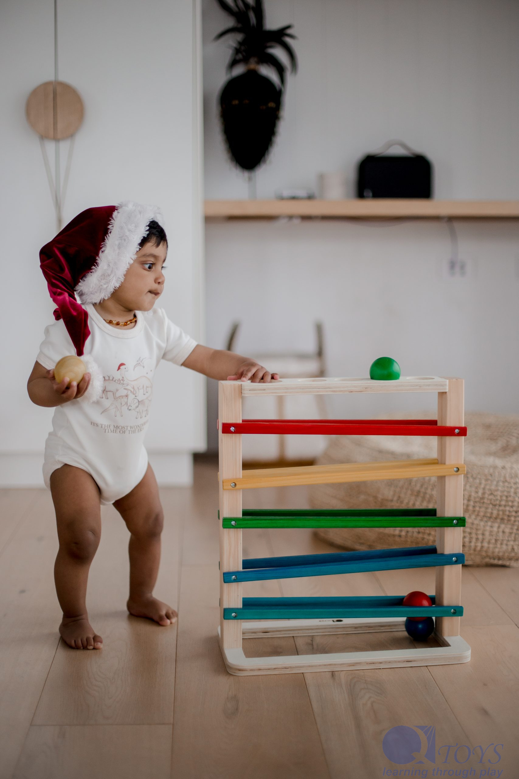 Through this activity children can also learn about cause and effect when they release the ball at the top of the track. This also encourages hand-eye coordination. Rolling activities increases a child’s curiosity which also encourage them to ask questions which in turn play an important role in language development. This activity promotes the development of children’s fine and gross motor skills as they pick up the balls and put it onto the track. Your child will love watching the ball roll down the different colored tracks.