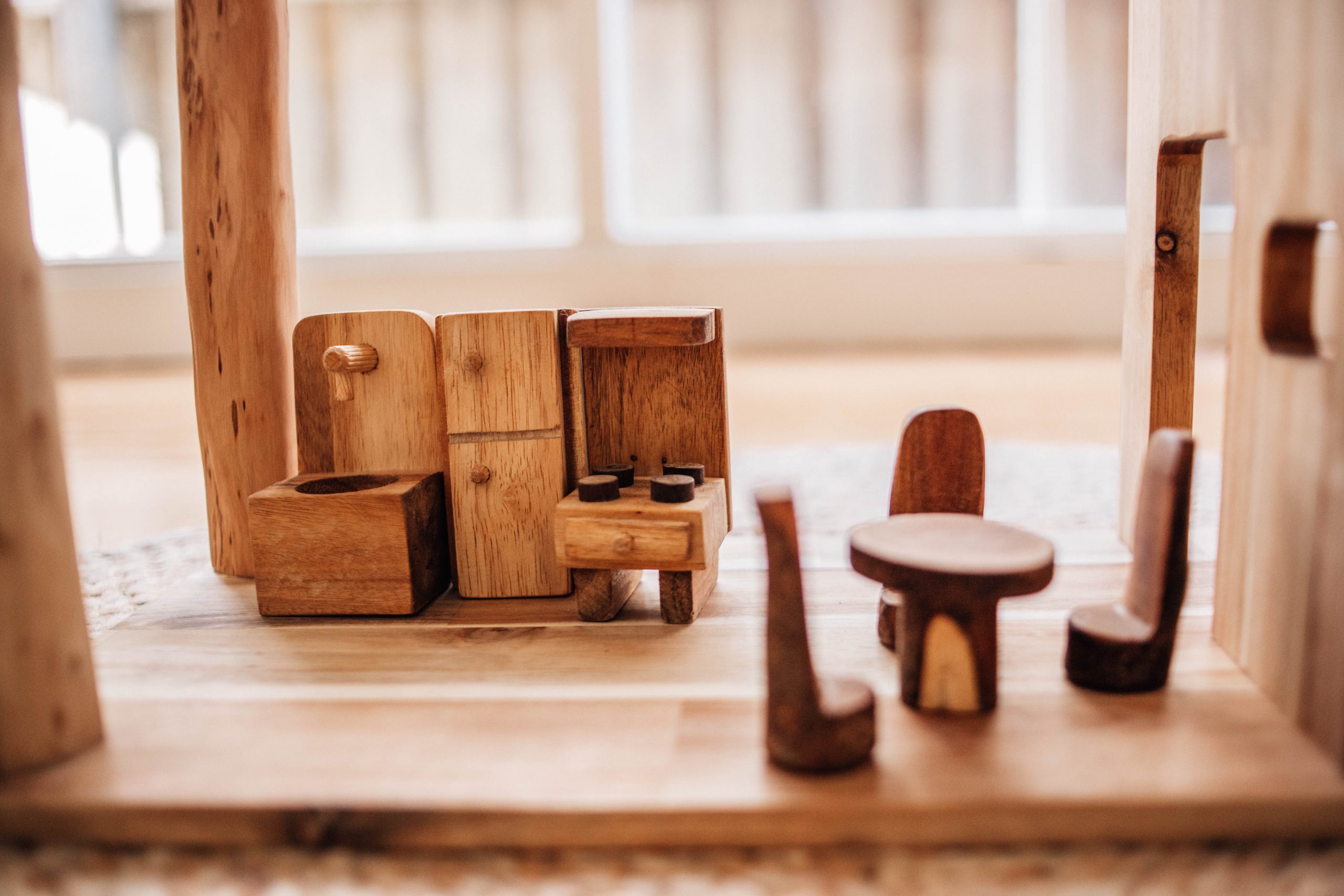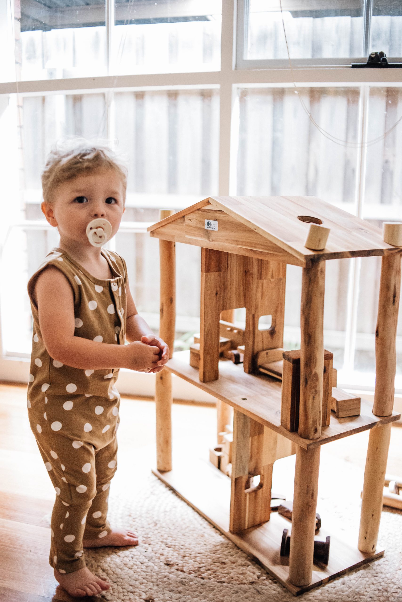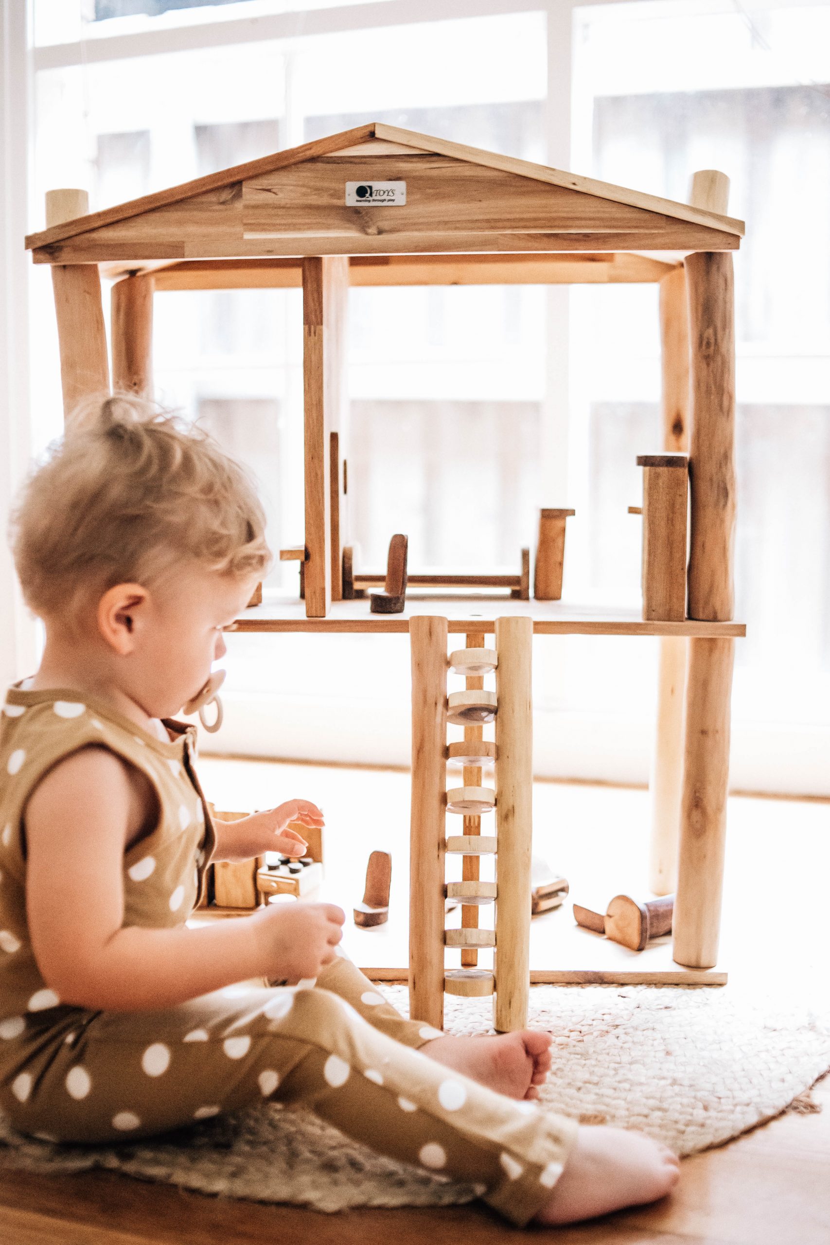 Looking for a toy house that can spark your childs imagination? Our gorgeous doll house is the perfect choice made of recycled rubber branches and acacia timber. The set is a DIY design which allows children to fix the house together as a construction activity. No tools required. All of our recycled tree branch doll furniture will fit nicely in this eco dollhouse. This doll house comes with the ladder as per photo.